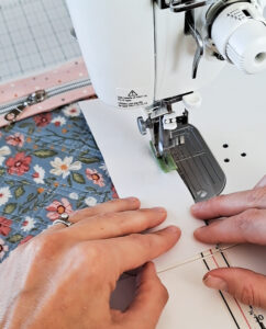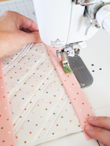 - In the photo below, I am attaching the Binding to the side of one of the vinyl pockets. The piece of vinyl is face down against the needle plate, and it was sticking slightly to the machine bed. You can see my left hand gently pulling the piece through the needle, helping out those feed dogs push the vinyl through. I’m also lifting the panel up a bit to try to keep the vinyl off of the machine bed as much as possible. Just make sure you aren’t pulling too hard, as you don’t want to bend your needle and cause it to break–the goal is to just gently help the vinyl so it doesn’t stick as much. You can also use the paper trick here, too! Put a piece of paper under as much of the vinyl as you want, and the vinyl won’t have a chance to stick to the bed.